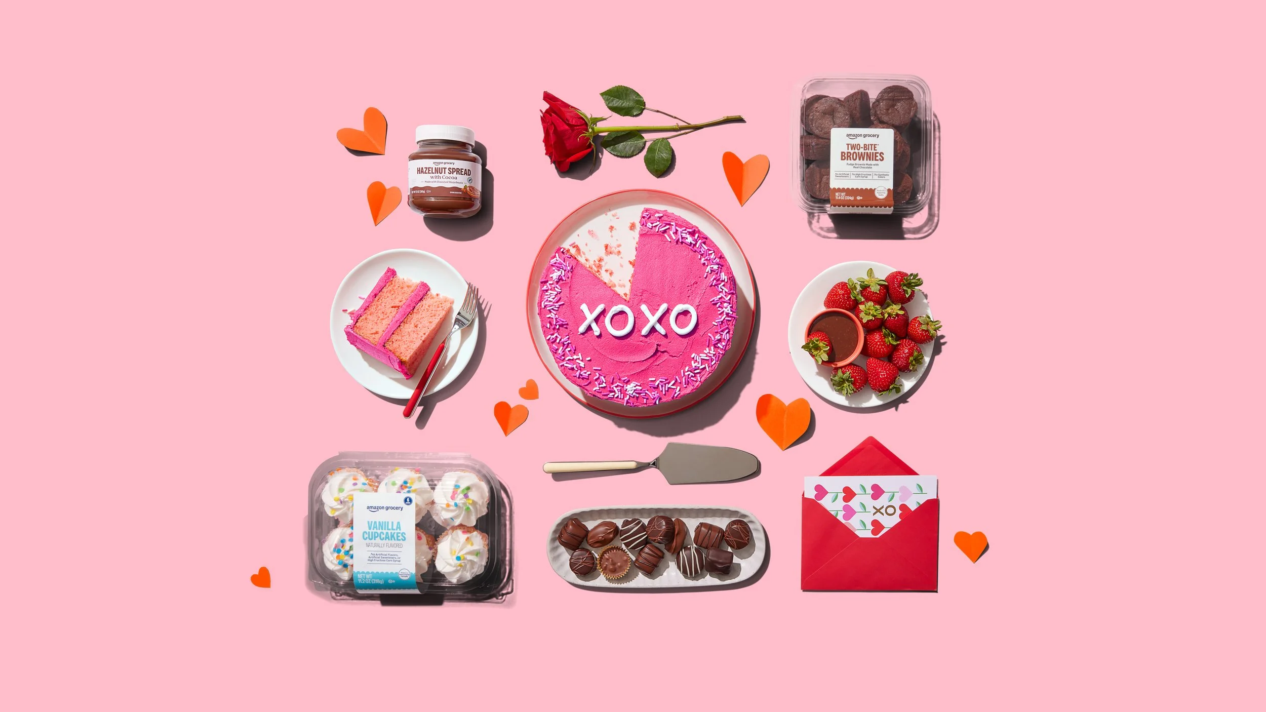 For graphic elements, paper hearts were used as a prop in our creative assets. These paper hearts should be placed organically, in varying scales, and angles. They should be placed around products to support the creative with ASIN treatments.