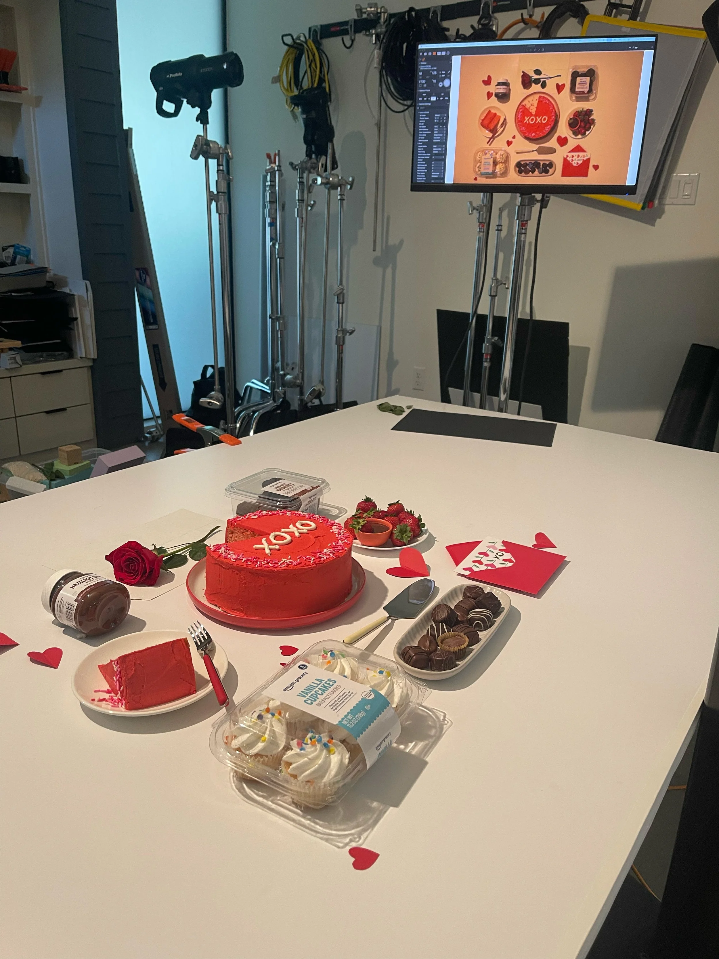 Direction on props is to use minimal, neutral props with secondary pops of color–using a mix of simple dinnerware (white, red, ceramic), with some heart-shaped dinnerware for visual storytelling. We also took advantage of risers, having a variety of sizes.